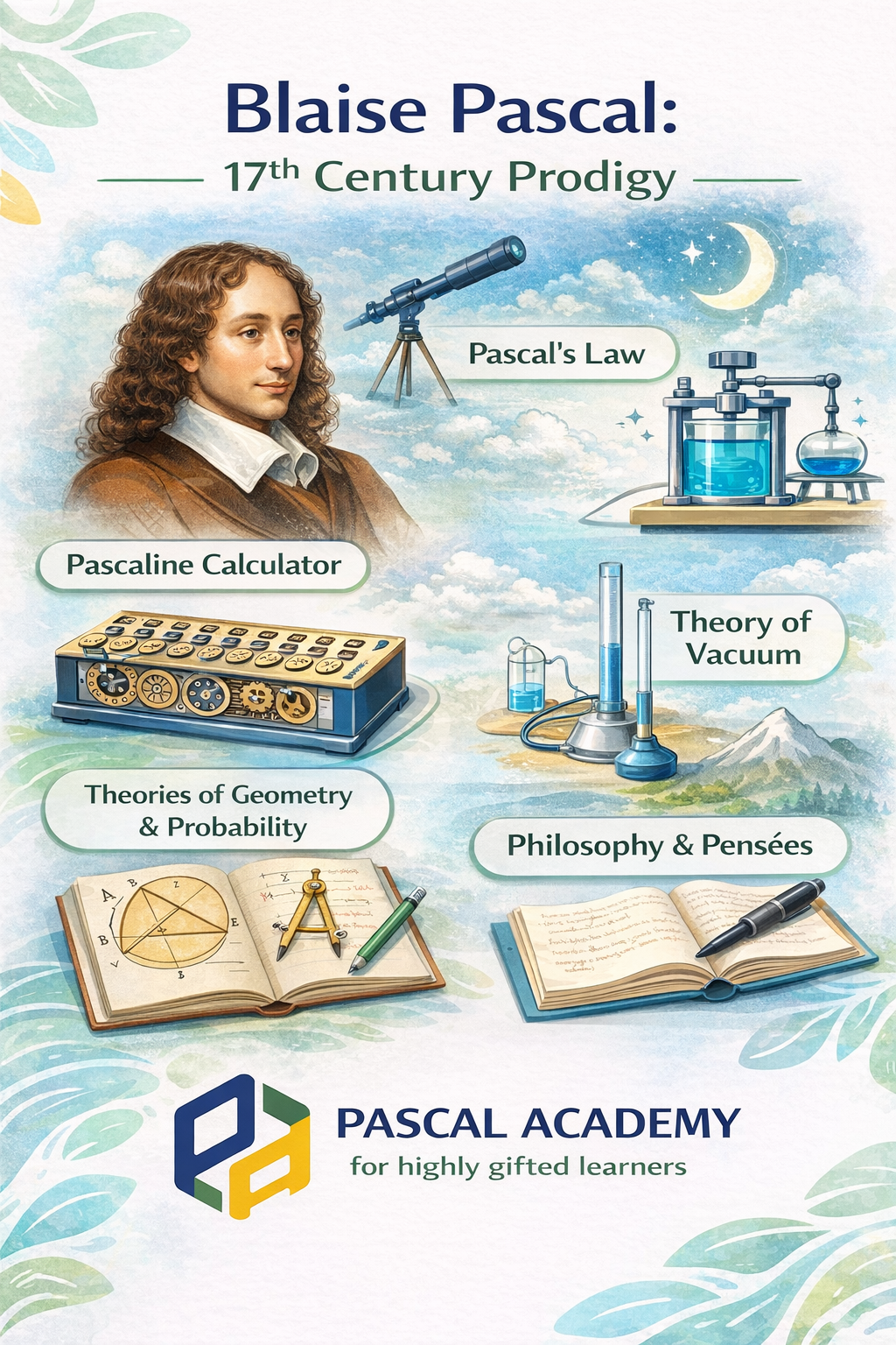 Pascal Academy is named after Blaise Pascal, a 17th century child prodigy, mathematician, scientist, and philosopher whose work spanned mathematics, physics, and theology. Were Pascal educated today, he would likely struggle with deep frustration in a conventional classroom, constrained by rigid pacing and surface-level instruction. His life and legacy reflect the intellectual curiosity, interdisciplinary thinking, and moral seriousness we aim to cultivate in our learners.